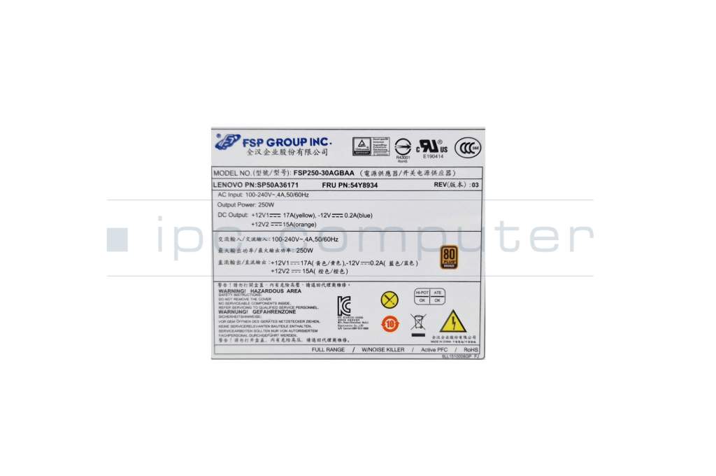 Alimentation du Ordinateur de bureau 250 watts (Longueur du câble : P1 33 cm / P2 61cm) original pour Lenovo IdeaCentre 300S-11ISH (90D9)