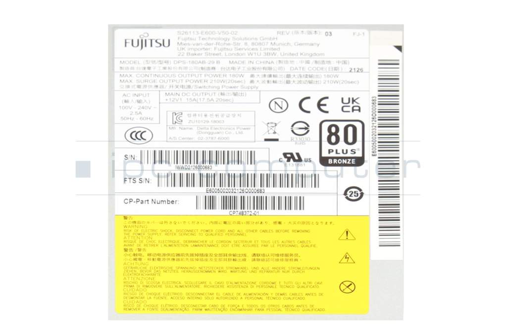 S26113-E600-E50 original Fujitsu alimentation du Ordinateur de bureau 180 watts